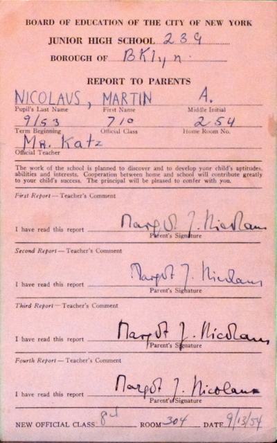 In the fall of 1953 I went to I.S. 239, the junior high school a few blocks away from the elementary school. By this time I could talk quite a bit, and I was getting good marks in English class, but I was a first-generation immigrant and so I was put in the vocational track. I am grateful for that to this day. We were introduced to the basics of woodworking; you made a lamp with a pump handle for a switch. We had electrical shop and learned about wiring, soldering, batteries, light bulbs, electromagnets, and motors. I took more shop classes in later grades. I got to work with 19th-century printing equipment, pulling cold type letters one at a time from lower and upper cases, inserting them in a handheld composing stick, locking them in a chase with a quoin, and running a proof. In sheet metal shop, I learned how to use tin snips, punches, and the brake.
